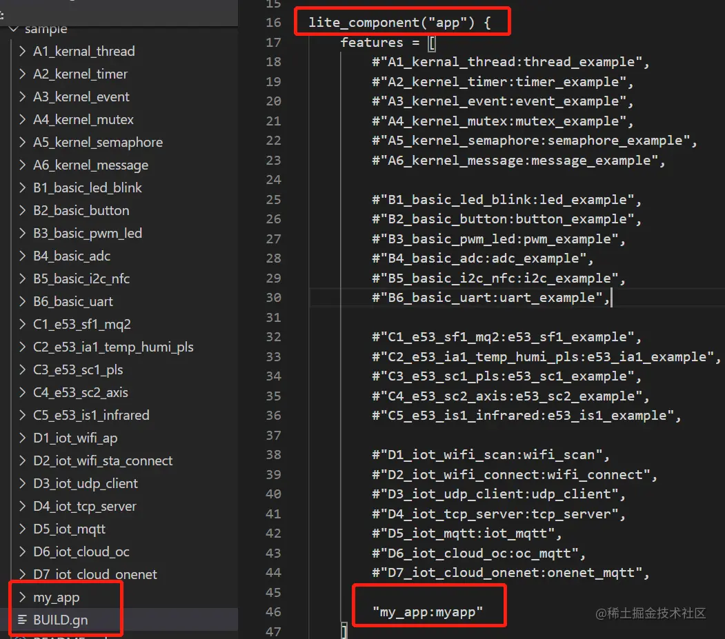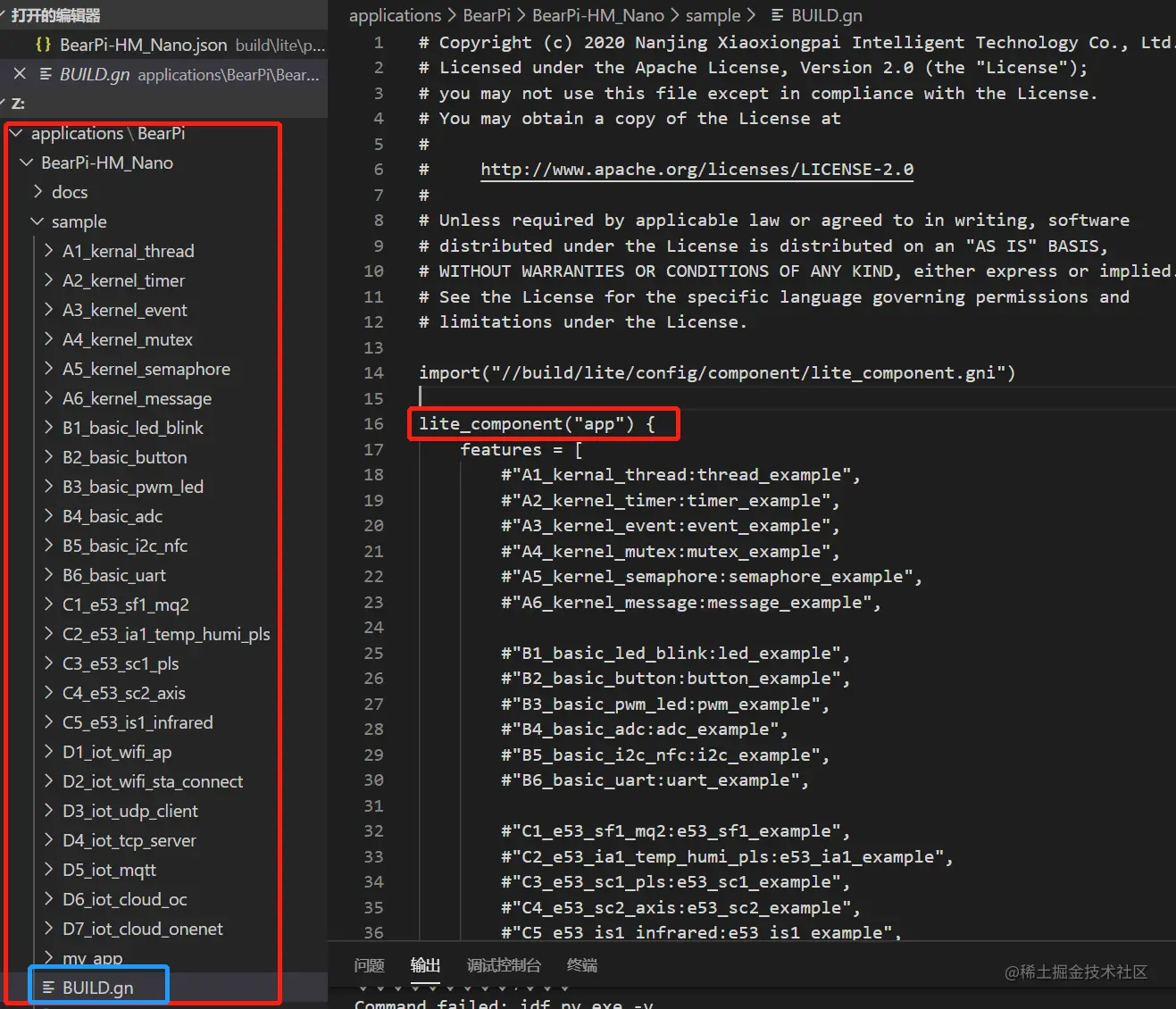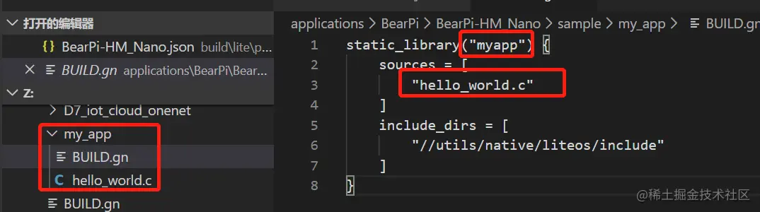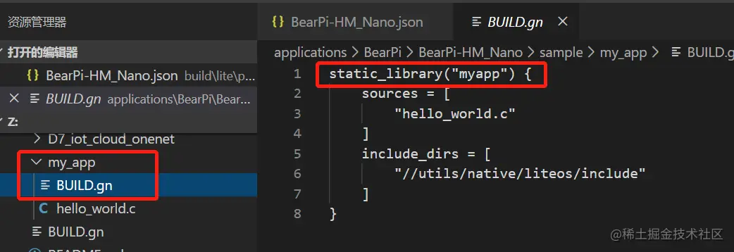 模块BUILD.gn 的 app 下有许多模块,其中 my_app:myapp 指向位于 applications/BearPi/BearPi-HM_Nano/sample/my_app 下的 业务BUILD.gn 。