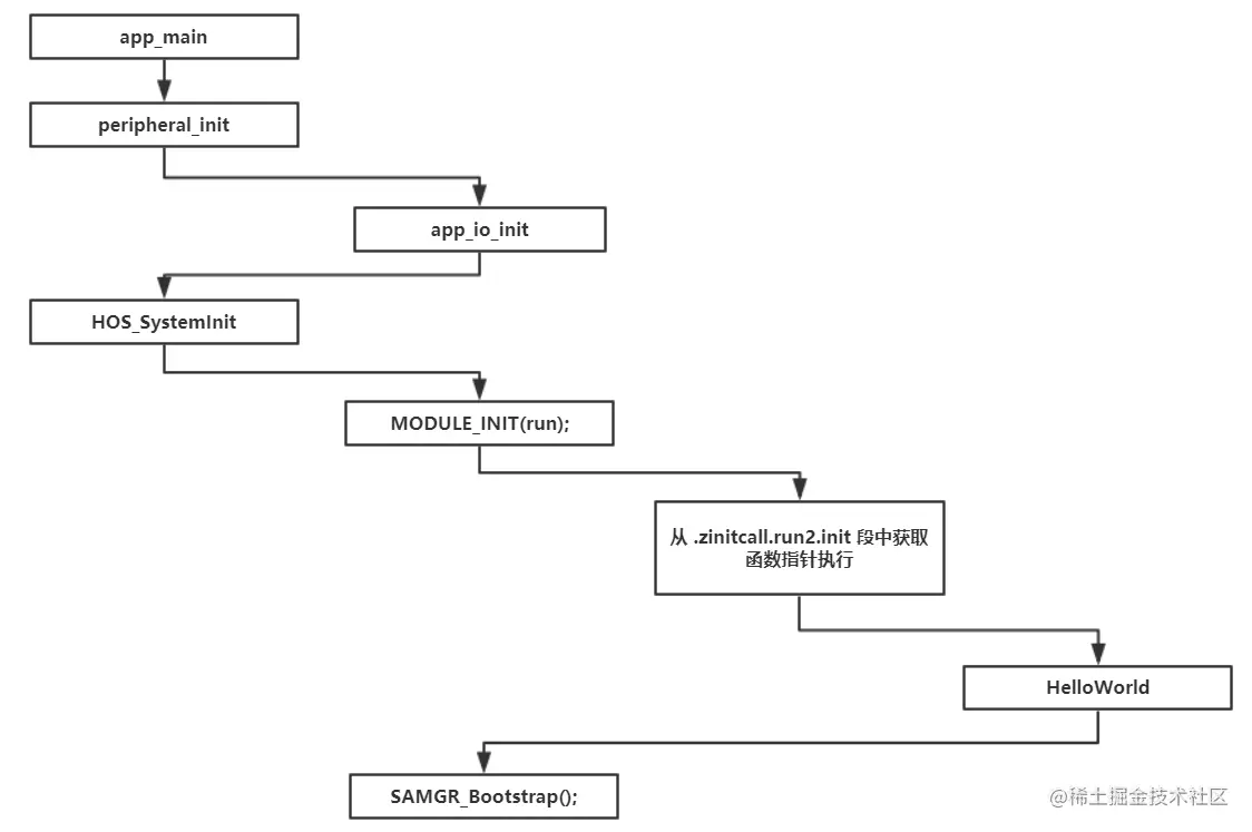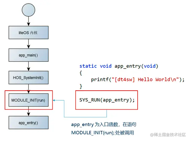 SYS_RUN(app_entry) 定义的函数指针 __zinitcall_run_app_entry 通过强制编译的方式进入 .zinitcall.run2.init 段中。在链接脚本中定义的两个符号 __zinitcall_run_start (理解为数组名)和 __zinitcall_run_end 分别指向 __zinitcall_run_app_entry 所在数据段的起始位置和结束位置。 又因为 MODULE_INIT(run) 的功能就是遍历 __zinitcall_run_start 和 __zinitcall_run_end 所指定的区域(理解为函数指针数组),并调用每个单元(指针)所指向的函数,因此,__zinitcall_run_app_entry 所指向的函数必然被调用,即:app_entry() 必然被调用。