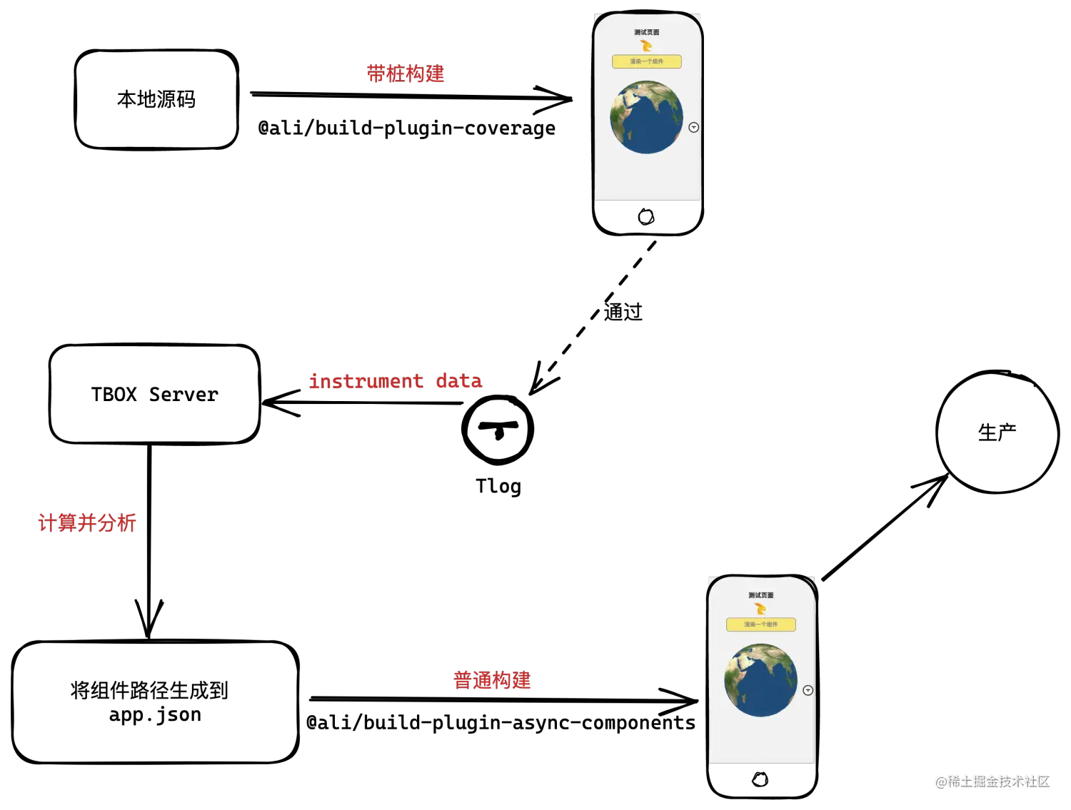 我们能通过代码覆盖率统计出哪些组件的代码首屏使用率为0(或者门槛值30%以下),并在项目工程中自动生成一个持久化的文件配置(app.json中),之后依据配置将这些低使用率的组件代码在生产构建时将产物代码改写为动态引入。
