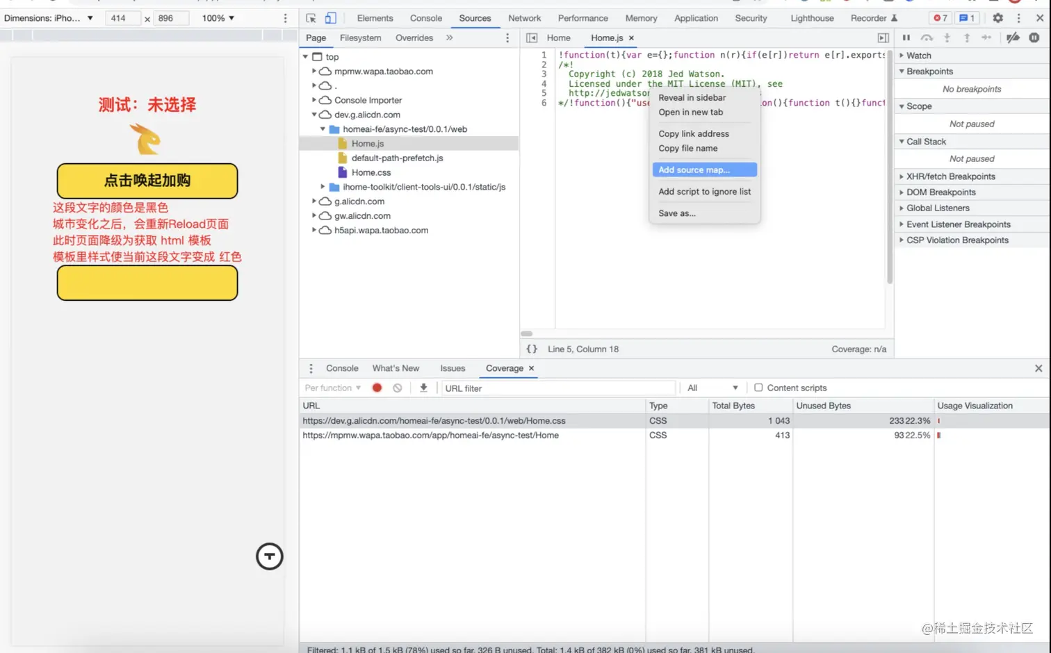 **TIPS:**当然,如果在拥有 source map 的情况下也是可以用浏览器查看源代码的覆盖率的: