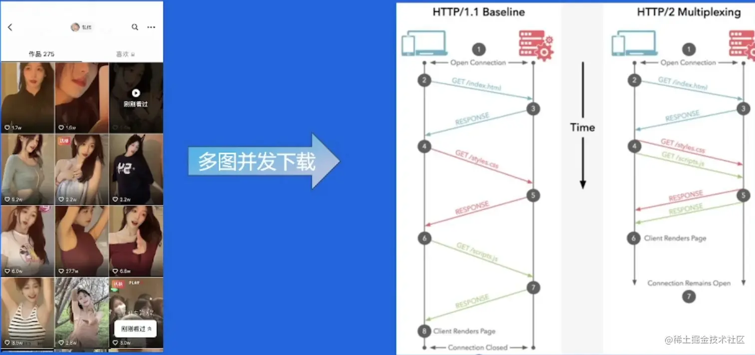 - 多路复用:多个图一起请求,一起响应
