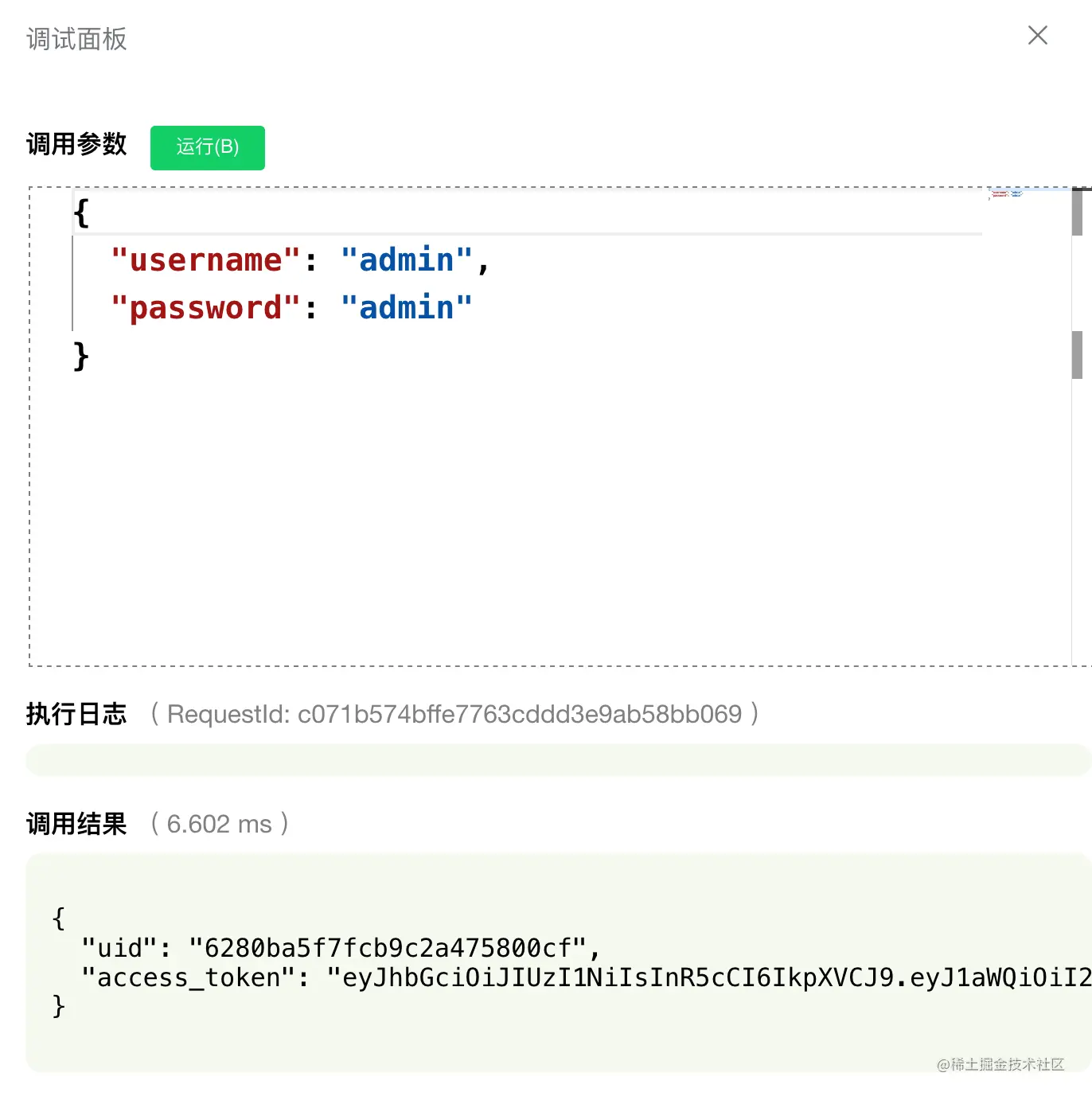 $ curl -X POST -H "Content-Type: application/json" -d '{"username": "admin", "password": "admin"}' https://APPID.lafyun.com/login