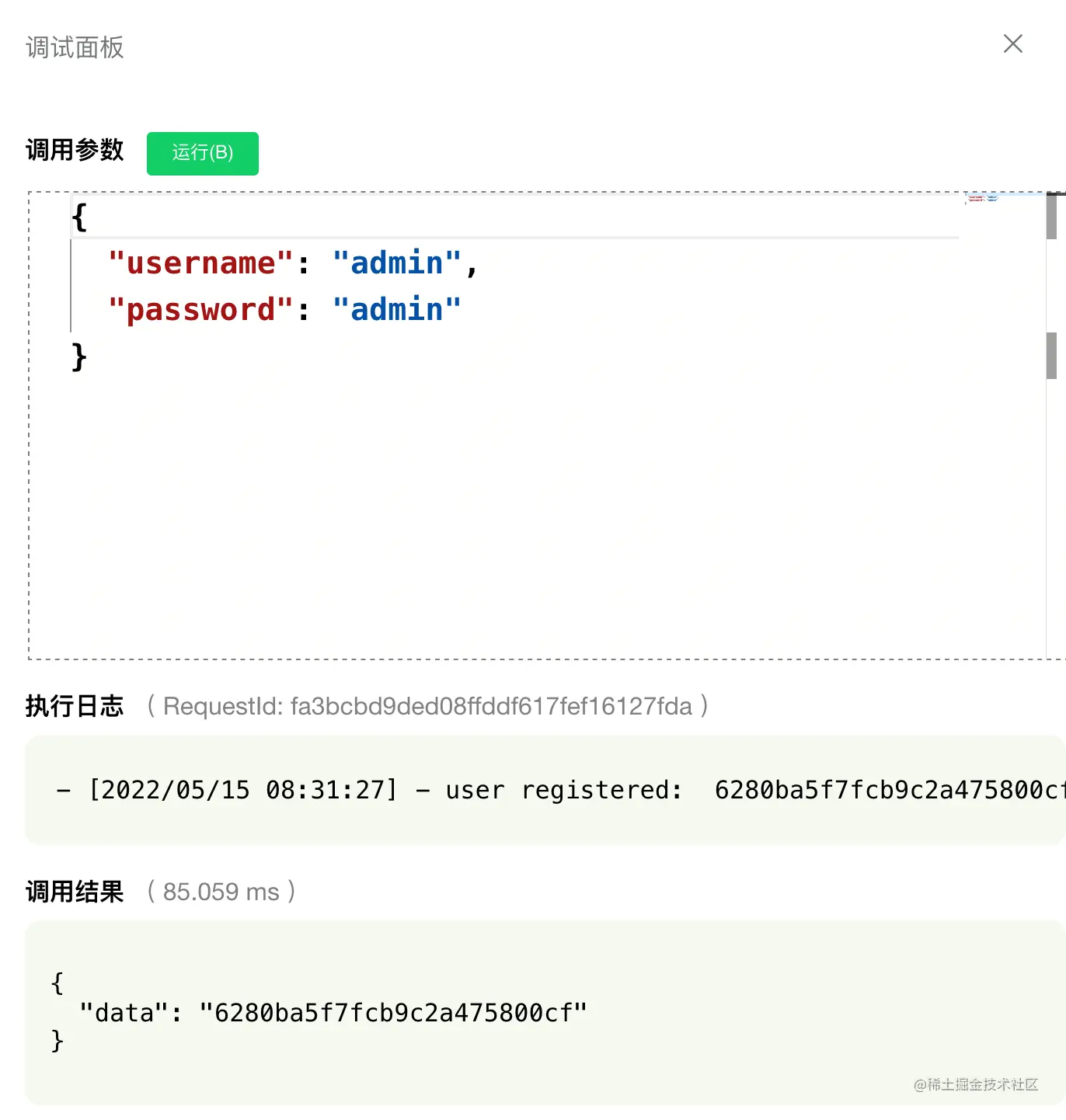 $ curl -X POST -H "Content-Type: application/json" -d '{"username": "admin", "password": "admin"}' https://APPID.lafyun.com/register