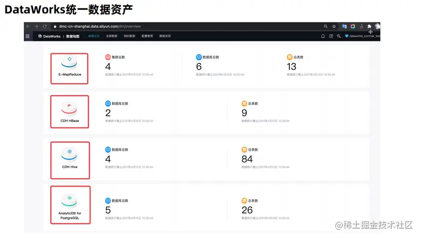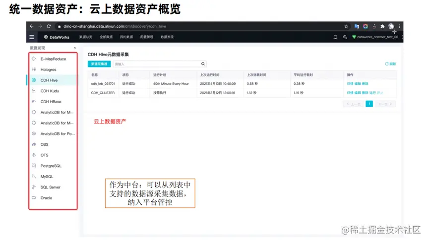 DataWorks统一了各种数据资产,比如E-MapReduce,CDH HBase,CDH Hive和AnalyticDB for等。不但能在数据地图中看到全域的数据资产,而且还支持从数据源里抽取元素与信息。