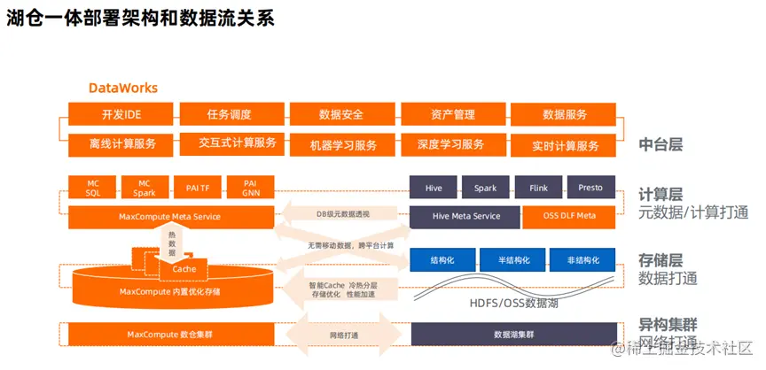 如上图所示,在整体架构中,我们首先将数据湖集群和MaxCompute数仓集群的网络打通,然后将存储层的数据打通,确保智能Cache,冷热分层,存储优化和性能加速。在计算层,我么实现了DB级元数据的透视,避免数据孤岛。