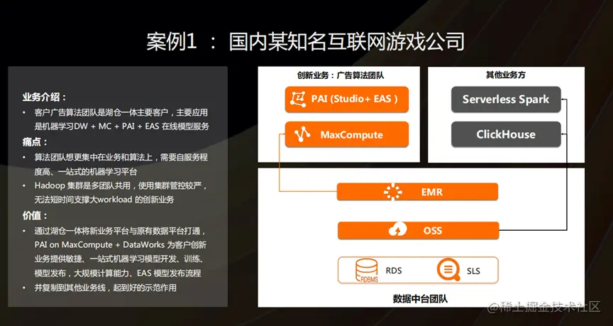 某互联网游戏公司的广告算法团队是湖仓一体主要客户,主要应用是机器学习DW+MC+PAI+EAS在线模型服务。该团队的自服务程度高、需要一站式的机器学习平台。而Hadoop集群有多团队共用,使用集群管控较严,无法短时间支撑大workload的创新业务。