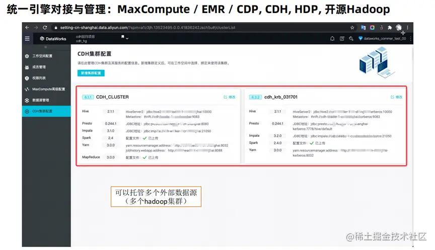 在单一引擎内部,可以挂载多个hadoop集群,实现统一引擎的对接与管理。