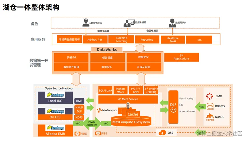 湖仓一体的整体架构,主要面向数据分析师,数据科学家以及大数据工程师来使用。主要应用的业务有Machine,非结构化数据分析,Ad-hoc/BI,Reporting和Learning等等。在整体架构中,DataWorks作为数据统一开发管理的平台,主要负责数据安全,开发IDE,任务调度和数据资产管理等综合工作,确保平台稳定运行。