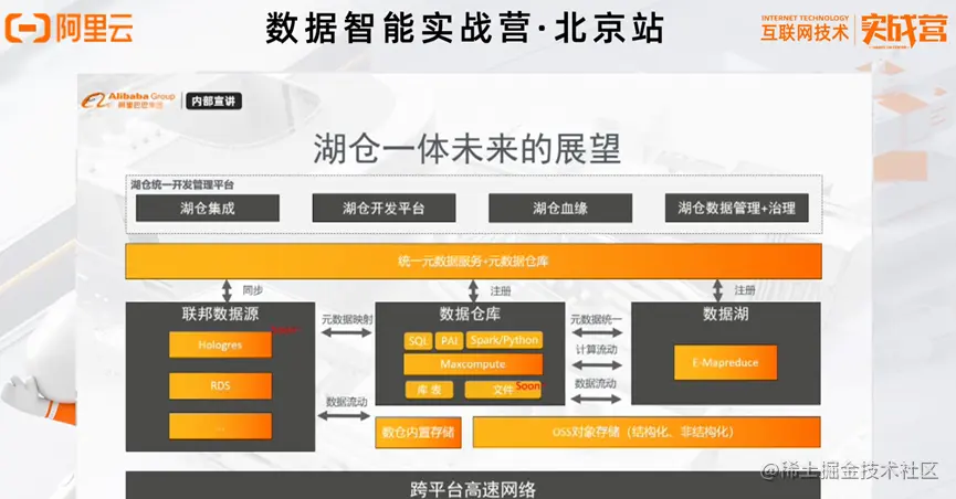 在未来,湖仓统一开发管理平台,能够实现湖仓数据的一站式管理与治理。OSS的对象存储不但支持结构化数据,也能支持非机构化数据。整个平台不但能同步联邦数据源,而且能统一元数据服务和元数据仓库。
