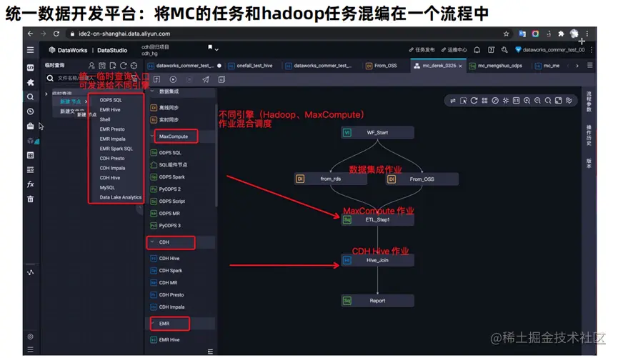 DataWorks作为统一的数据开发平台,能够将MC的任务和hadoop任务混编在一个流程中。不但可以统一临时查询入口,发送给不同的引擎。而且可以将不同的引擎作业混合调度。比如数据集成作业,MaxCompute作业以及Hive作业等。