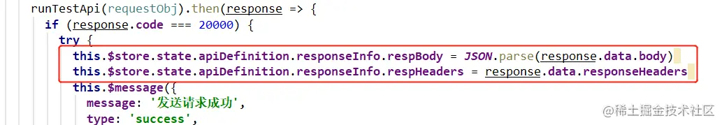 所以,现在发送请求成功后,要把获取到的信息赋值给 vuex 中的对应字段。因为返回内容改了,所以body的赋值也要重新改下,再加上新增的respHeaders赋值即可。