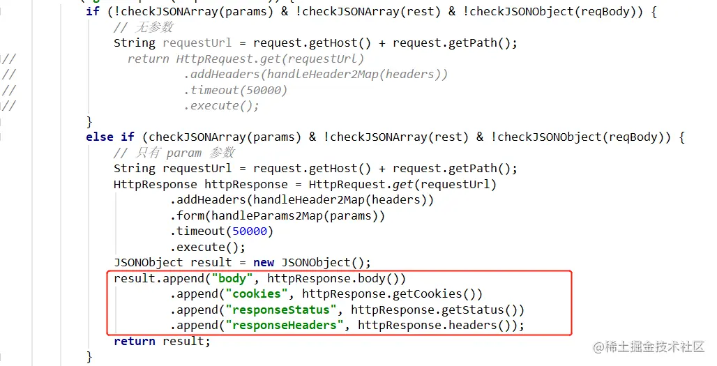 在 hutool 的 http 客户端中,httpResponse对象是包含了很多信息的,这里目前只先用这几个:body、cookies、responseStatus、responseHeaders。获取到之后放到一个新的对象里返回出去。