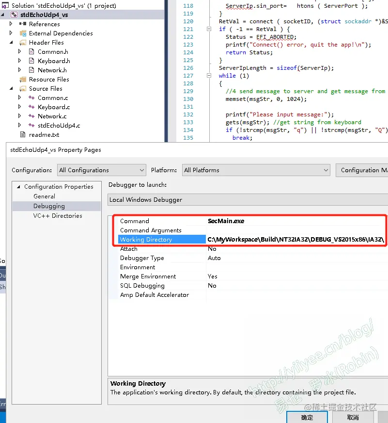打开vs工程文件的属性页,在Debugging选项下,将Command段填入“SecMain.exe”,Working Directory段填入“C:\MyWorkspace\Build\NT32IA32\DEBUG_VS2015x86\IA32\”。