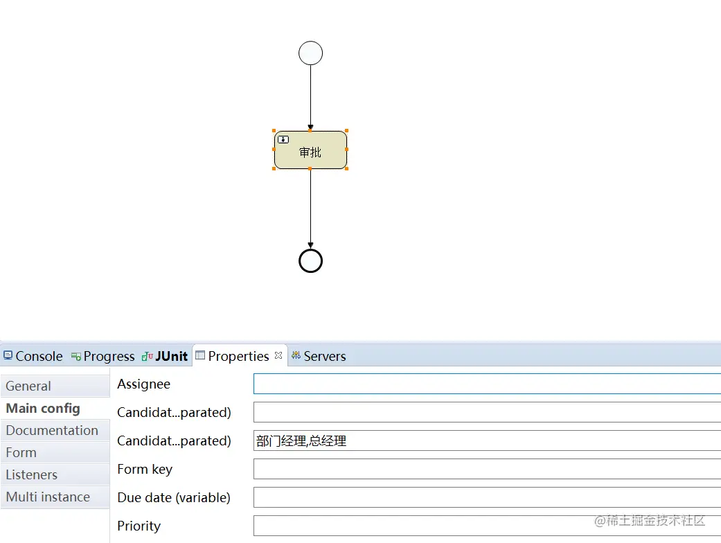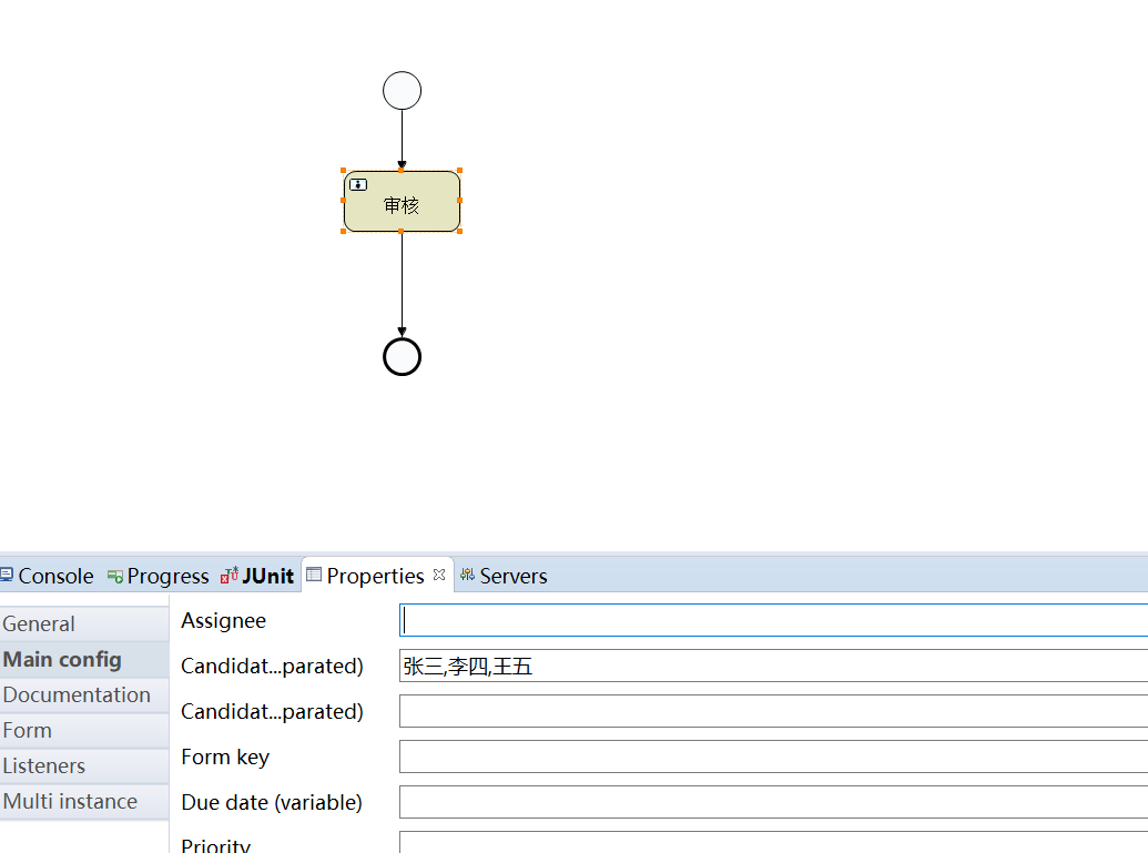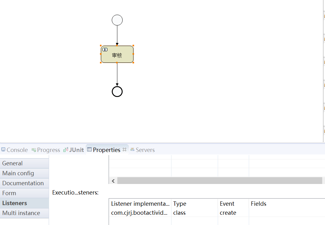 public class Test { // getDefaultProcessEngine会读取activiti.cfg.xml ProcessEngine processEngine = ProcessEngines.getDefaultProcessEngine(); /** * 部署流程 */ @org.junit.Test public void deploy() { //读取资源文件部署 Deployment deploy = processEngine.getRepositoryService().createDeployment() .addClasspathResource("bpmn/helloWorld.bpmn").addClasspathResource("bpmn/helloWorld.png").deploy(); // act_re_deployment部署对象表 // act_re_procdef 流程定义表 // act_ge_bytearray 资源文件表 System.out.println(deploy.getId()); System.out.println(deploy.getName()); } } -