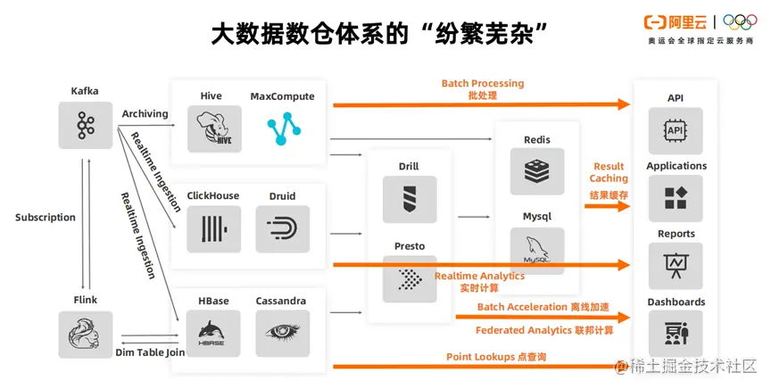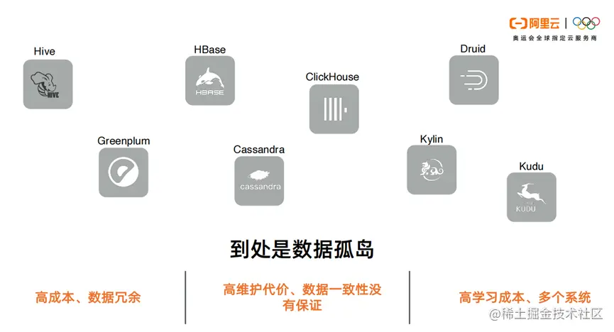 整个架构高成本的背后是因为有多套组件和多套存储。而多套存储带来了多份数据孤岛,导致数据的一致性无法保障。每个系统都有自己的运维方式,开发方式和使用方式。从而增加了运维成本和学习成本。