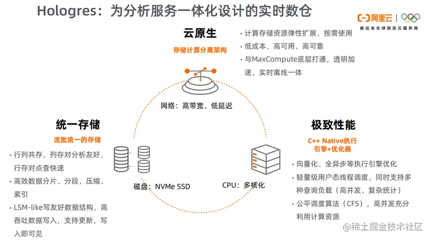 阿里云的Hologres为分析服务一体化,设计的实时数仓。在云原生方面,与MaxCompute底层打通,透明加速,实时离线一体。在流批一体的存储方面,高吞吐数据写入,支持更新,写入即可见。在性能方面,随着CPU的多核化,我们对向量化、全异步等执行引擎优化,充分利用计算资源。