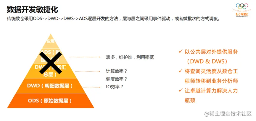 最后,数据开发敏捷化。在未来,希望通过技术创新,通过空云原生的弹性能力,减少人类的瓶颈。以公共层对外提供服务,将查询灵活度从数仓工程师转移到业务分析师,让卓越计算力解决人力瓶颈。