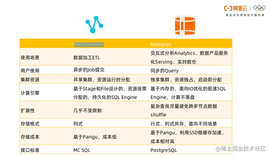 该怎么选择MaxCompute和Hologres?这两个技术的技术原理是完全不同。MaxCompute有典型的做数据加工场景,计算过程是异步的,资源按需分配。扩展性几乎不受限制,接口标准是MC SQL。Hologres的所有任务都是同步的,复杂查询尽量避免跨多节点数据shuffle,基于Pangu,利用SSD做缓存加速,成本相对高。接口标准是PostgreSQL。