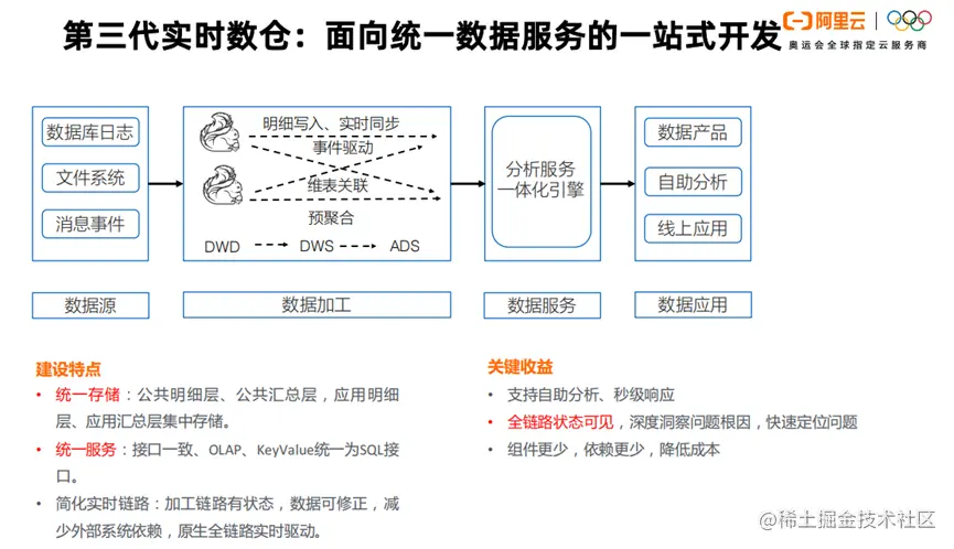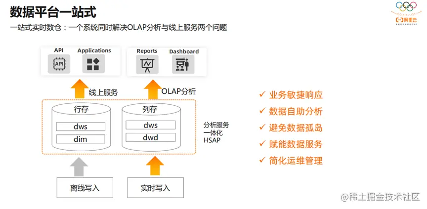 一站式的实时数仓,一个系统能同时解决,OLAP分析与线上服务两个问题。一定要满足业务敏捷响应,数据自助分析,避免数据孤岛,赋能数据服务,简化运维管理。