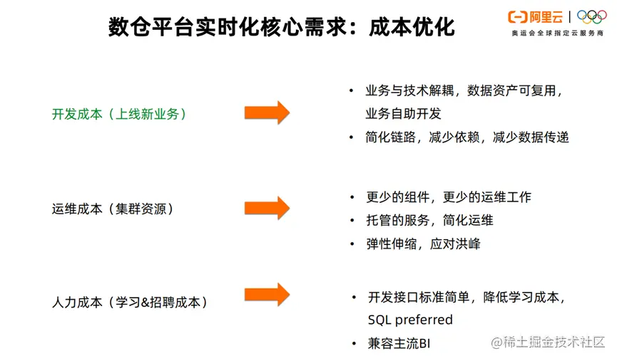 数仓平台实时化的第三个需求就是降低成本。这里主要分为开发成本,运维成本和人力成本。其中,最核心的是开发成本。我们不但要让业务与技术解耦,实现数据资产复用,业务自助开发。还要简化链路,减少依赖和传递。在运维方面,组件不但要具备很好的弹性能力,还要有托管服务,从而降低运维成本。在人力成本方面,我们要降低技术门槛和学习成本。