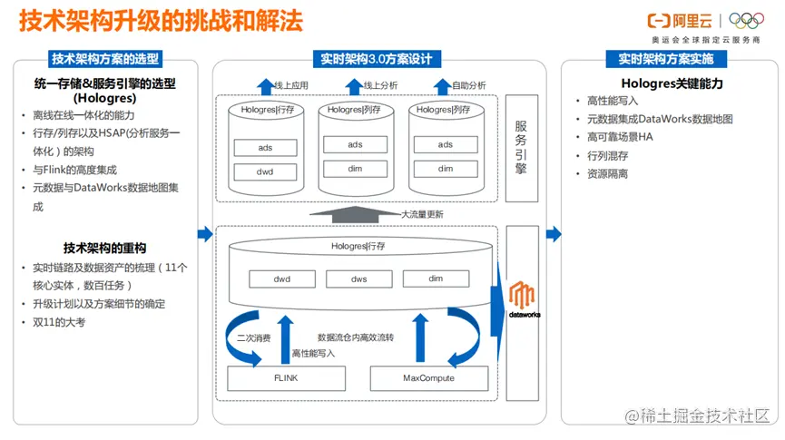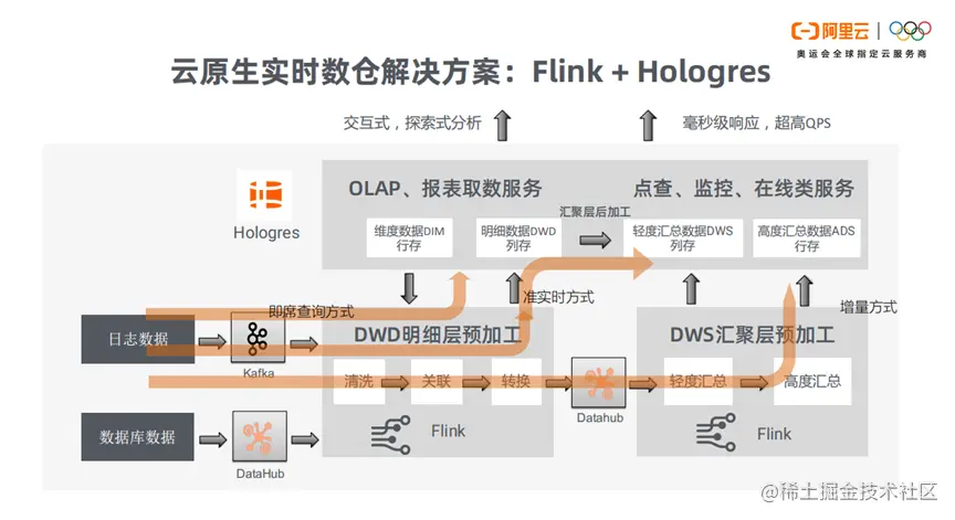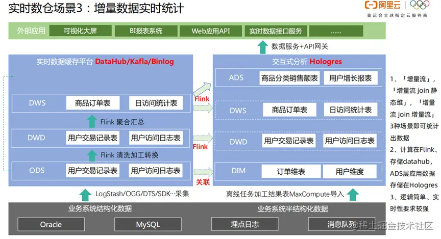 增量数据的实时统计,只要通过增量流,增量流join静态维,增量流join增量流,这3种场景,就能统计出数据。然后通过Flink计算、datahub进行数据存储。而ADS层的应用数据存储在Hologres。逻辑简单,实时性强。