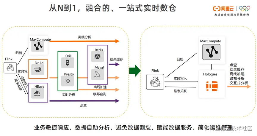 上图是一站式实时数仓的演进。无论是交互式分析,联邦查询,还是在线的高性能点查都可以减少数据的传递和依赖。数据离线加工的部分,我们继续使用MaxCompute。数据实时加工的部分使用Flink。避免数据割裂,赋能数据服务,简化运维管理。