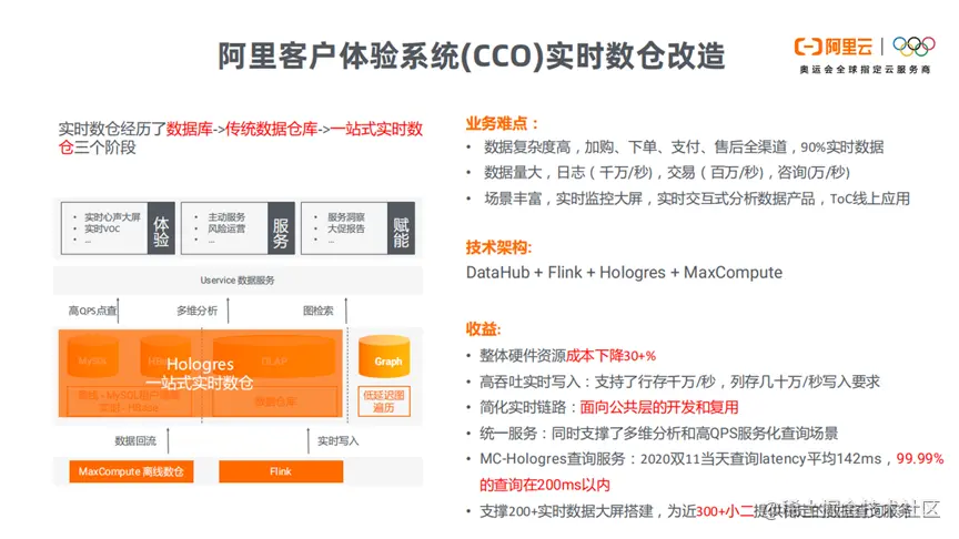 通过DataHub+Flink+Hologres+MaxCompute的技术架构,CCO的整体硬件资源成本下降30%,实时写入支持行存千万/秒,列存几十万/秒写入要求。在2020双11当天,查询latency平均142ms,99.99%的查询在200ms以内。除此之外,还能够支撑200+实时数据大屏搭建,为近300+小二提供稳定的数据查询服务。