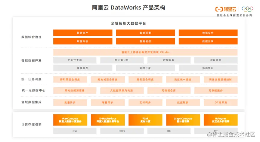 上图是阿里云的重要组件DateWorks。DateWorks由很多组件组成,其中包括数据治理,数据开发,数据调度,元数据管理等模块。DateWorks集成了阿里云不同的引擎,提供了优秀的元数据管理能力和企业及治理能力。