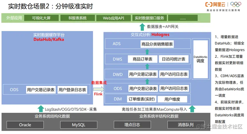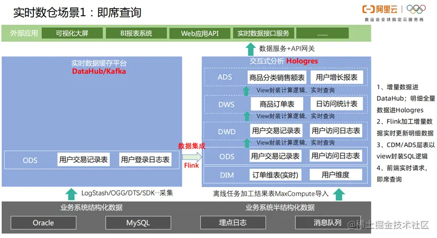 实时数仓的数据分析,主要应用在可视化大屏、Web应用API、BI报表系统、实时数据接口服务等等。首先,将业务系统的结构化数据,采集到实时数据缓存平台。初步分类之后,增量数据进DataHub;明细全量数据进Hologres。然后进行数据集成,Flink加工增量数据,实时更新明细数据。