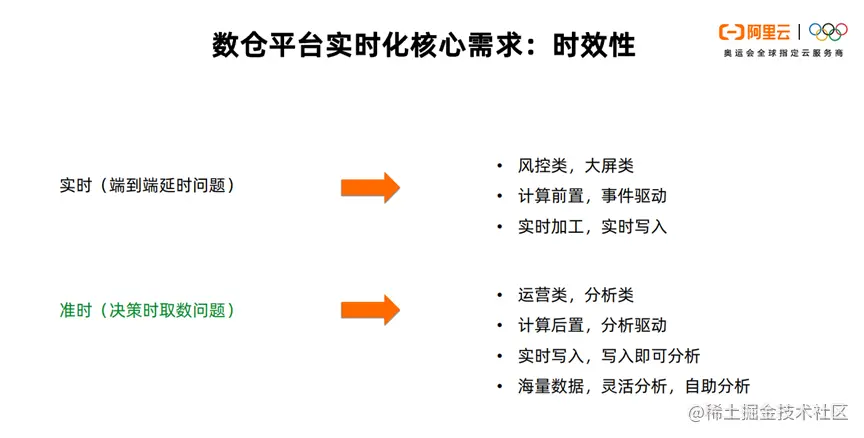 我认为数仓平台的时效性有两个概念,即实时和准时。其中,只有机器做决策的场景需要实时。比如端到端数据产生和延迟,大屏风控,计算延迟,事件驱动等等。而人类做决策的时间,一般以分钟/小时/天/月为准,极度新鲜的数据并不影响人类决策的本质。只有改变决策结果的系统,才是优秀的实时系统。比如海量数据的灵活分析,自助分析等等。