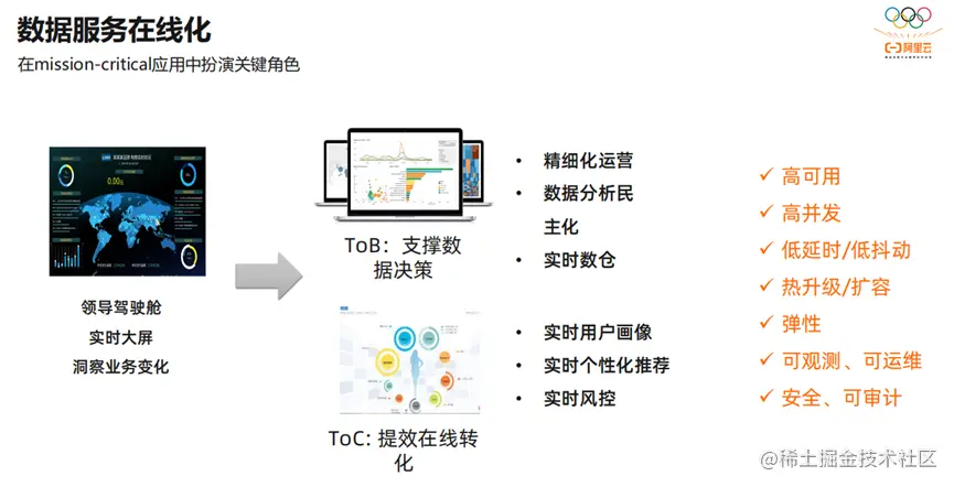 数据服务仅是内部系统,而且要成为外部的在线系统。不但能支撑数据决策,而且要提效在线转化。最终实现数据平台的高可用,高并发。数据的低延时/低抖动,安全可靠。