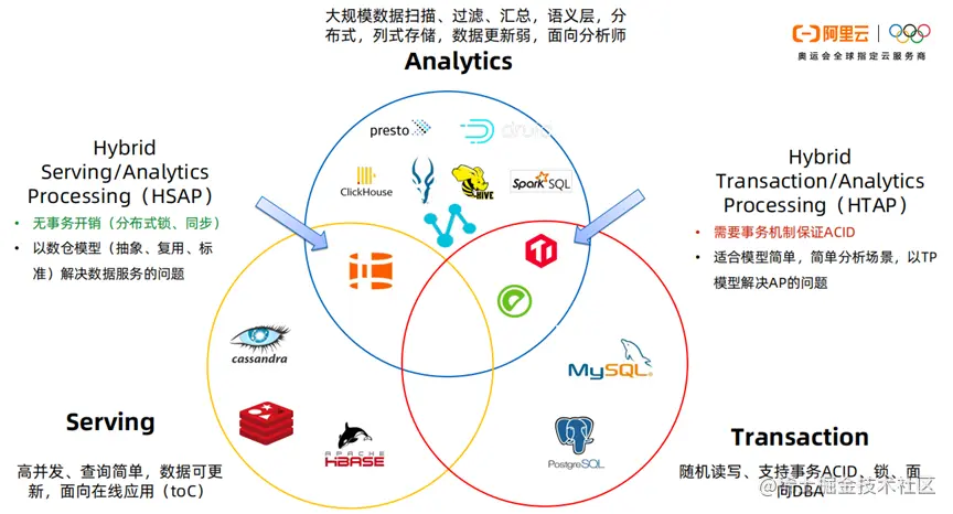 我通常将存储分为三类。第一类Transaction在线的事务系统。适合模型简单的分析场景,以TP模型解决AP的问题。第二类Analytics系统,这个系统的往往采用分布式,列存,索引。通各种压缩技巧,把海量数据分析做到极致。第三类是Serving系统,这类系统能毫秒级的响应,每秒支持上万的qps,以只读为主,更新简单。