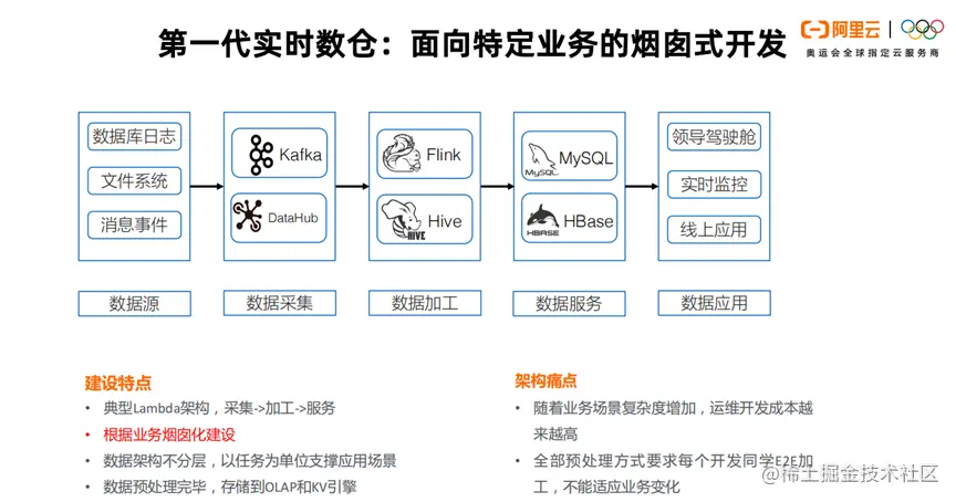 接下来,我们看看离线实时一体化数仓的发展。如上图所示,阿里巴巴的第一代实时数仓,主要面向特定业务,做烟囱式开发。我们用典型的Lambda架构,实行采集,加工,服务的三步走策略。根据特定业务,进行烟囱化的建设。以任务为单位支撑应用场景,当数据预处理之后,存储到OLAP和KV引擎。但随着业务场景越来越复杂,运维开发成本越来越高。烟囱式的开发方式,已经不能适应业务变化。