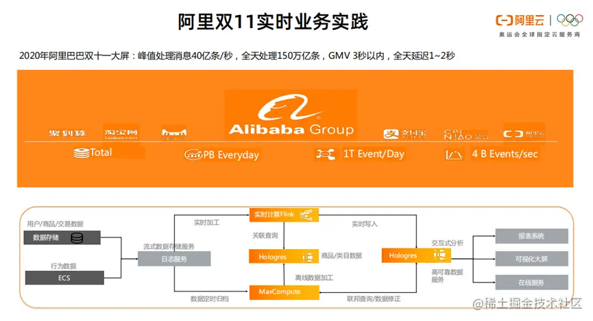 接下来,我们讲一讲阿里巴巴离线实时一体化数仓建设的实践。2020年阿里巴巴双十一大屏,峰值处理消息40亿条/秒,全天处理150万亿条,GMV 3秒以内,全天延迟1~2秒。这些数据主要来自两个渠道。第一,结构化的订单数据。第二,用户点击时,产生的点击流数据。数据收集汇总之后,一部分数据进入实时加工链路,进入Flink。另一部分数据以归档的方式,进入离线数仓。离线系统以MaxCompute为主,在线系统以Hologres为主。