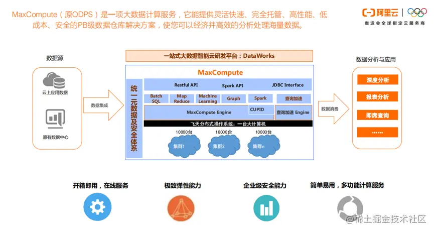 因为MaxComput是一项大数据计算服务。它能提供灵活快速、完全托管、高性能、低成本、安全的PB级数据仓库解决方案。所以当数据集成之后,数据进入Date Works平台,通过MaxComput,对数据进行深度分析,报表分析。MaxComput不但简单易用,拥有极致的弹性能力,而且拥有企业级的安全能力,充分保障企业的数据安全。