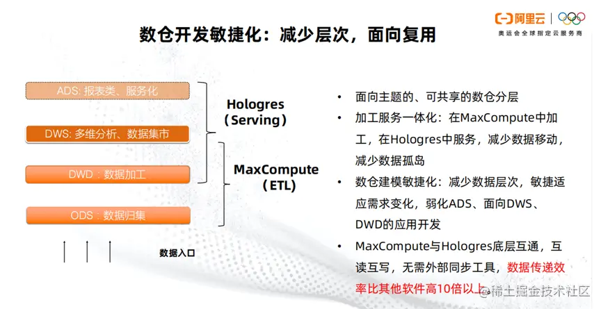 数仓开发应逐步实现减少层次,不断复用的目标。减少数据层次,敏捷适应需求变化,弱化ADS、面向DWS、DWD的应用开发。MaxCompute与Hologres底层互通,互读互写,无需外部同步工具,数据传递效率比其他软件高10倍以上。