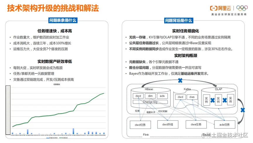 上图反映的是,阿里客户体验系统CCO过去三年,实时加工任务的发展。连续三年,成本100%的增长,导致运维压力大,成本消耗大。经过研究CCO的技术架构,我们发现实时任务有烟囱化的遗留问题。首先,KV引擎与OLAP引擎不通,没有统一的存储。其次,公共层任务链路过长,不同实例间的数据同步,作业发生了膨胀,导致维护成本越来越高。