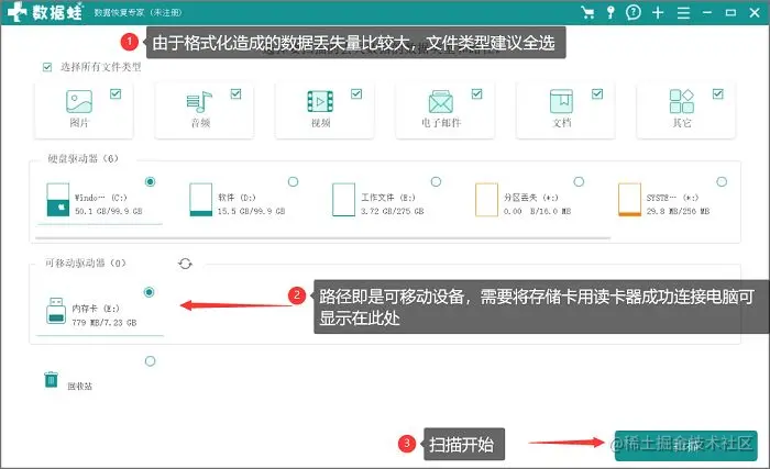 主要步骤:打开数据蛙数据恢复专家())www.shujuwa.net/shujuhuifu/ 后,在主页勾选丢失的文件类型(格式化的数据量较多,建议全选),随后再选择文件丢失前的路径,最后“扫描”并等待;