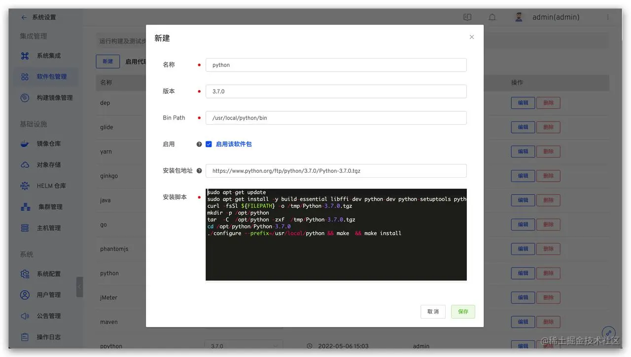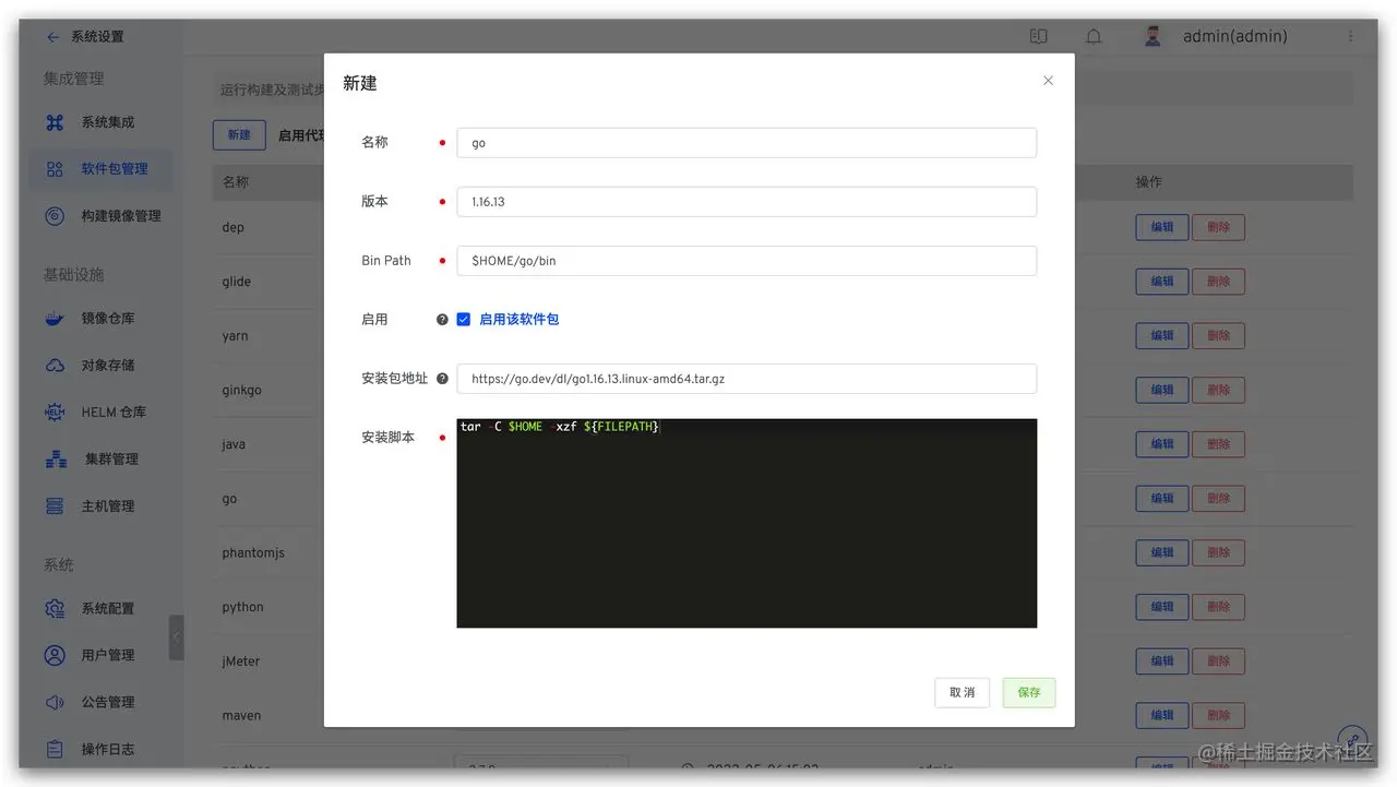 Zadig 系统有内置的 JMeter 应用可直接使用,如果内置版本无法满足自动化测试诉求,可参考官方文档中「软件包管理」按需新增。本例以 JMeter5.4.3 版本示例如下。 系统管理员登录 Zadig -> 访问系统设置 -> 集成管理 -> 软件包管理,添加 JMeter: