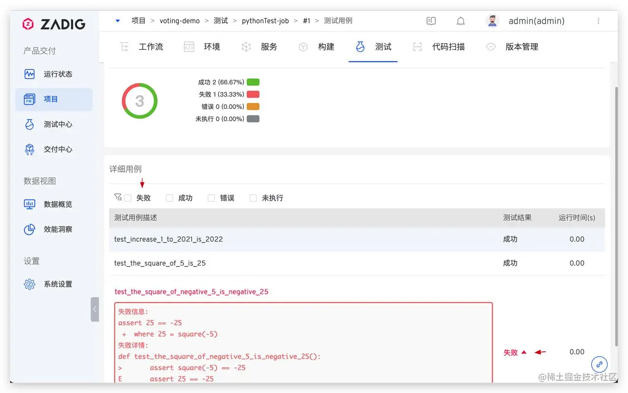 待自动化测试运行完毕后点击查看测试报告,可查看每一条用例的执行详情。对于失败的用例,可以快速过滤重点分析。