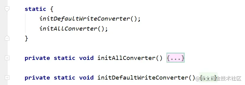 这里可以看到 EasyExcel 有两个私有的静态属性 defaultWriteConverter 与 allConverter,接着通过静态代码块对其进行了赋值。