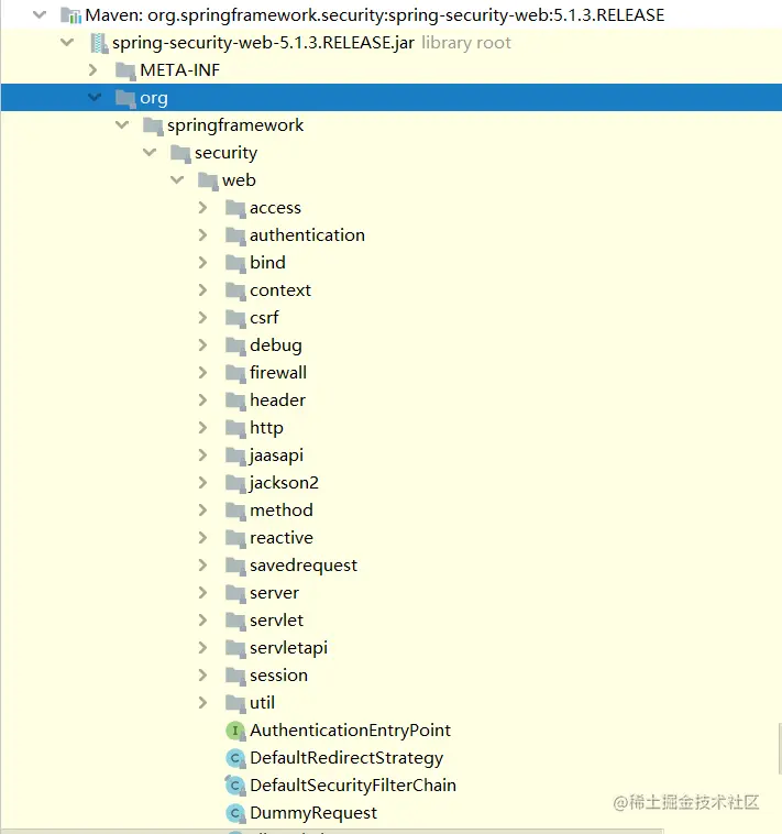 包含过滤器和相关的 Web 安全基础结构代码。任何与 servlet API 依赖的东西。如果您需要 Spring Security Web 认证服务和基于 URL 的访问控制,则将需要它。主要包是org.springframework.security.web。