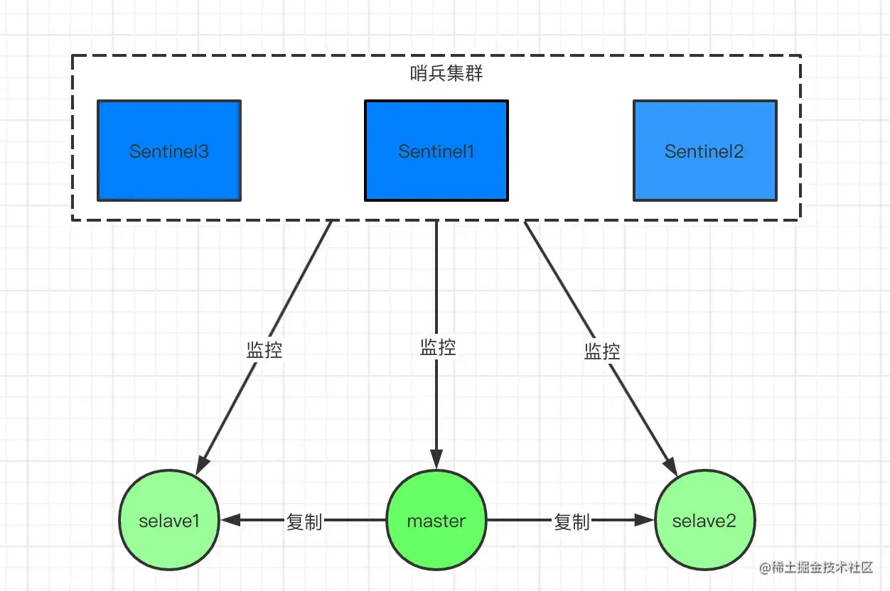 访问redis集群的数据都是通过哨兵集群的,哨兵监控整个redis集群。