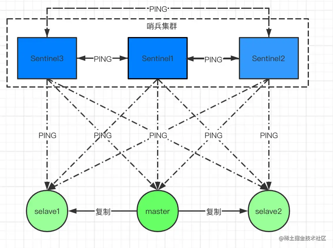 每个Sentinel以 每秒钟 一次的频率,向它所有的 主服务器、从服务器 以及其他Sentinel实例 发送一个PING 命令。