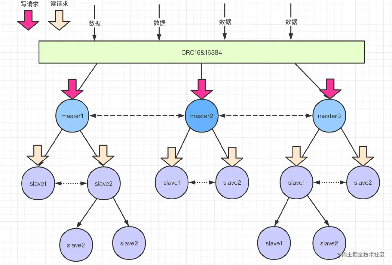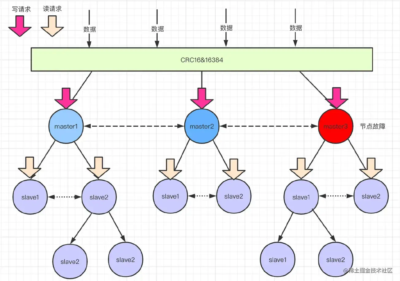 假如途中红色的节点故障了,此时master3下面的从节点会通过 选举 产生一个主节点。替换原来的故障节点。