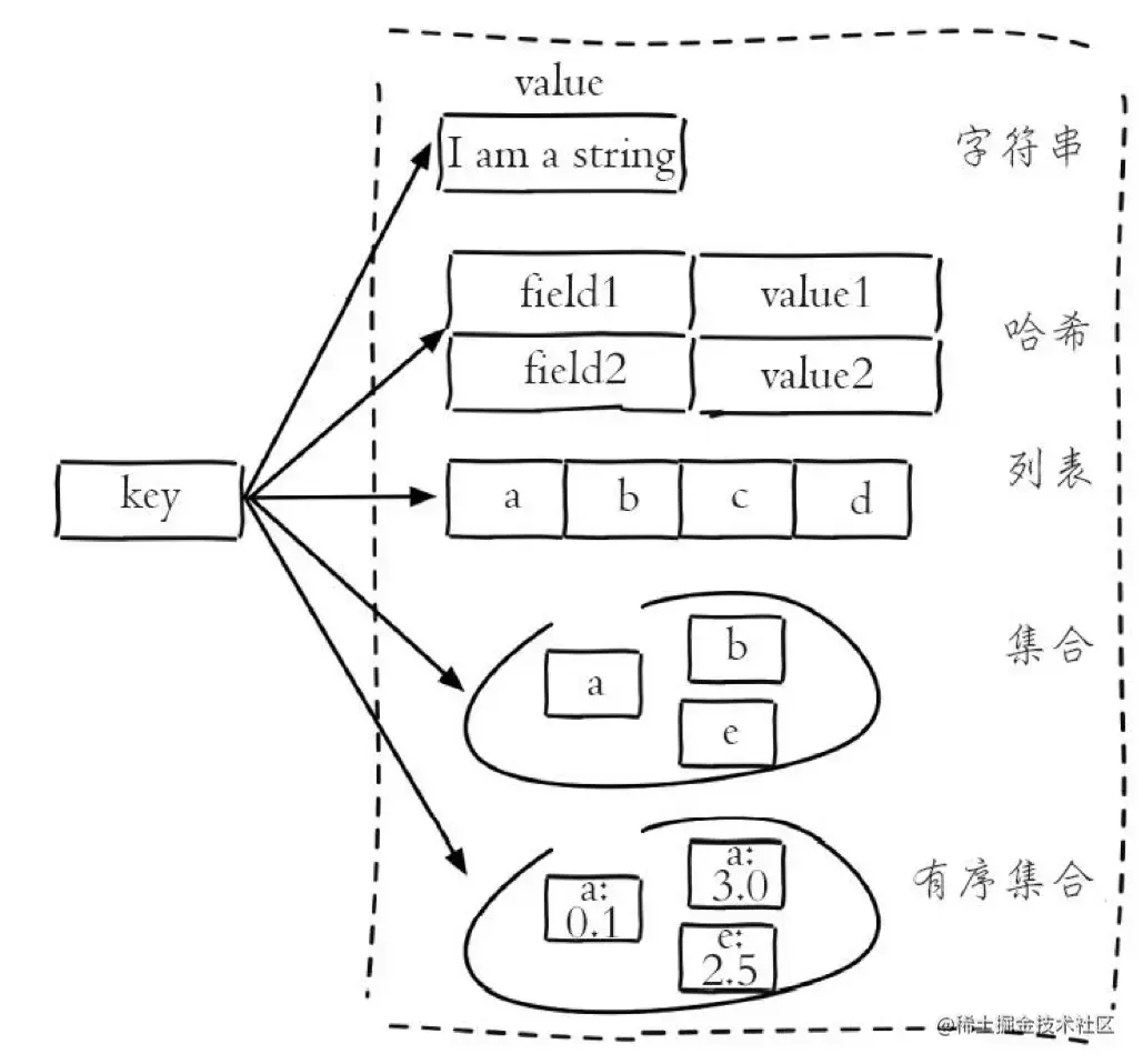 redis支撑五种数据类型,它们分别是:string(字符串)、hash(哈希)、list(列表)、set(集合)、zset(有序集合),但这些只是 Redis 对外的 数据结构。如图所示: