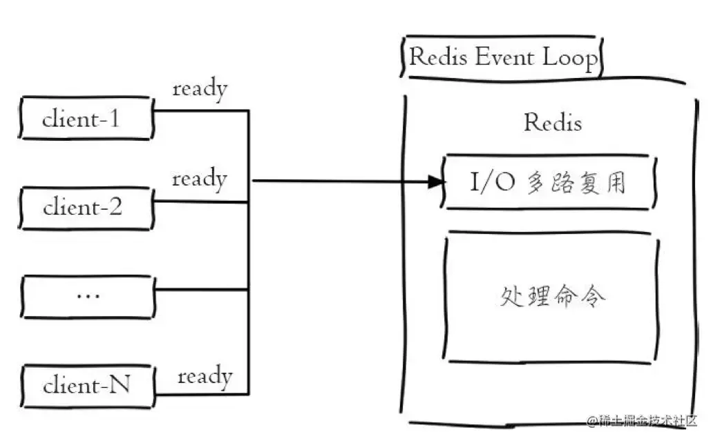 Redis 使用 epoll 作为 I/O 多路复用技术 的实现,再加上 Redis 自身的 事件处理模型 将 epoll 中的 连接、读写、关闭 都转换为 事件,从而不用不在 网络 I/O 上浪费过多的时间,如图所示:
