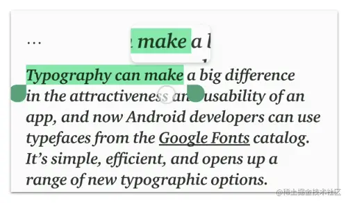 Android 文本提供了放大镜组件,通过放大镜可以更轻松地选择文本。Compose 现已支持文本放大镜。