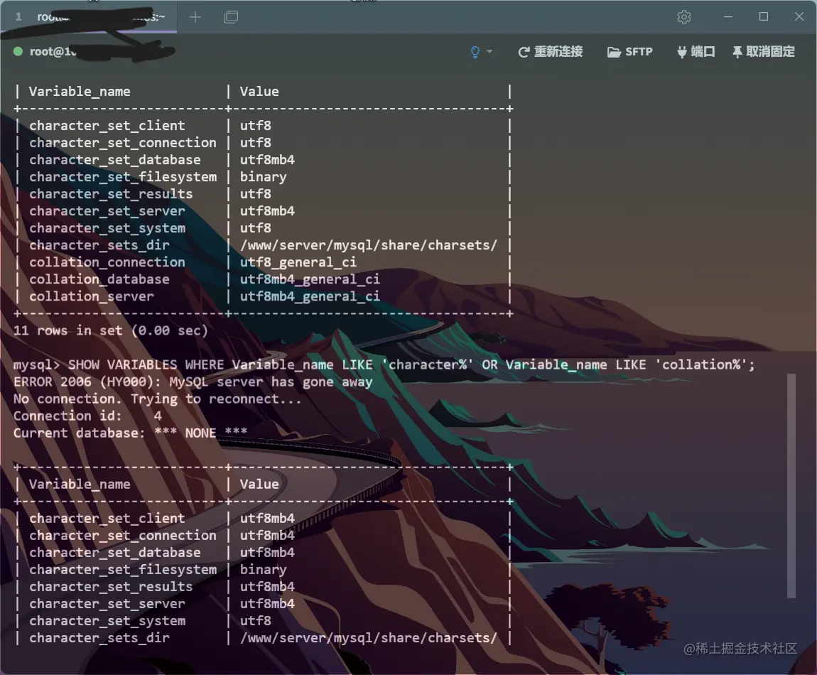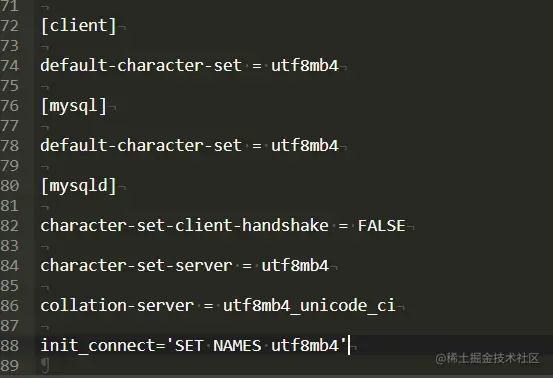 [client] default-character-set = utf8mb4 [mysql] default-character-set = utf8mb4 [mysqld] character-set-client-handshake = FALSE character-set-server = utf8mb4 collation-server = utf8mb4_unicode_ci init_connect='SET NAMES utf8mb4'找到之后直接将上面这串代码粘贴到文件的空位置,一般就最下面就可以。