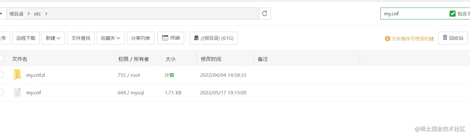 my.cnf**文件,Window是my.ini文件。宝塔面板直接找。